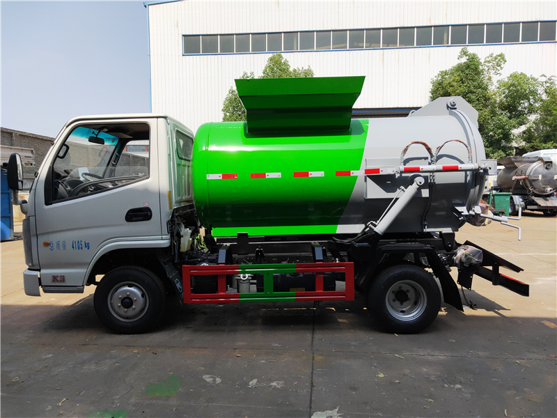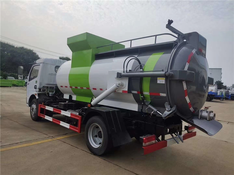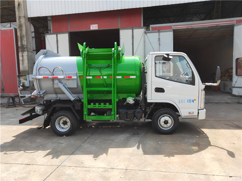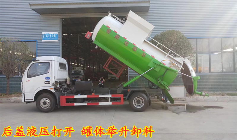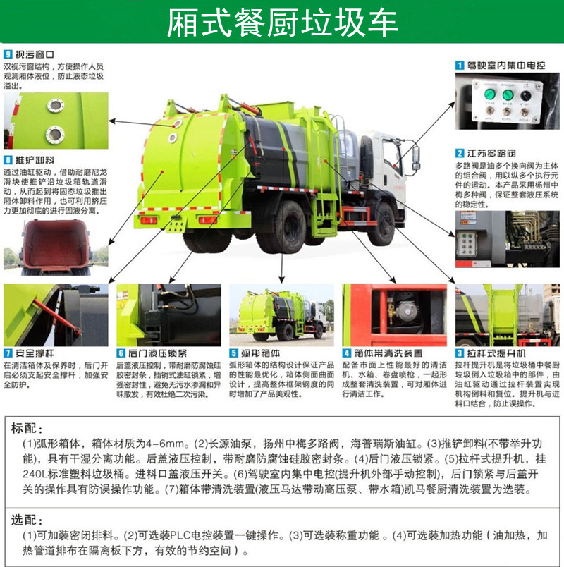 圓罐式餐廚垃圾車(chē):圓形罐體,罐體液壓舉升卸料,后蓋液壓打開(kāi)和鎖緊(帶耐磨防腐蝕硅膠密封條密封-后門(mén)關(guān)閉后滴水不漏),后門(mén)液壓鎖緊裝置,掛桶式提升機(jī),可配合120升、240升標(biāo)準(zhǔn)垃圾桶使用。